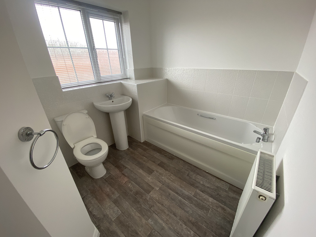 Having window to the front elevation, suite comprising of WC, hand wash basin, and Bathtub, finished with tiled flooring.