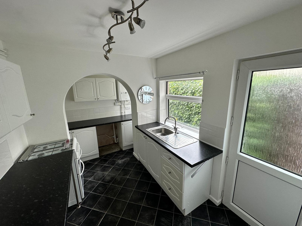 Having window and door to the side elevation, a mix of wall and base cupboards, stainless steel sink and drainer set into worktop, with additional cupboard and worktop space to the bottom of room ideal for a utility.