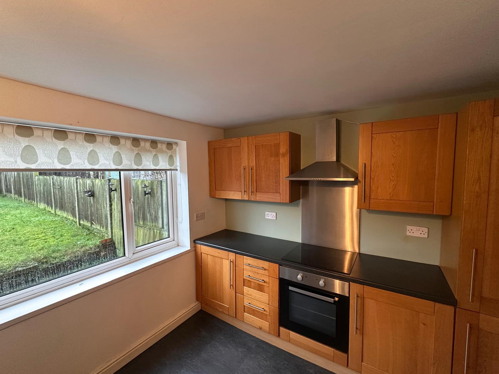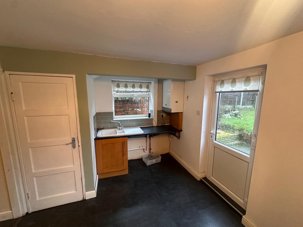 Having windows and UPVC door to the rear elevation, Complete with a range of cabinetry and worktop surfaces. It features an inset sink and drainer, integrated oven, electric induction hob with hood over and space for appliances, finished with tiled flooring.