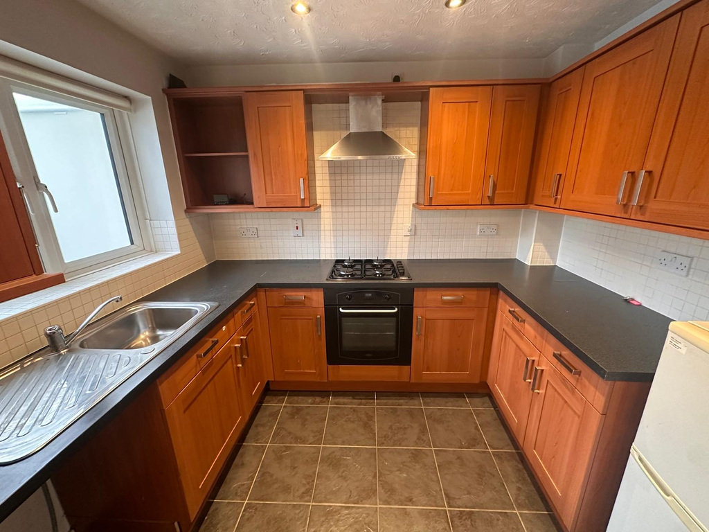 UPVc double glazed window overlooking the garden. A range of modern wall and base units with roll top work surfaces incorporating a stainless steel sink and drainer unit with mixer tap. Complimentary splash backs. Gas hob and electric oven. Extractor fan. Plumbing for washing machine. Space for fridge/freezer and dining table. Finished with tiled floor.